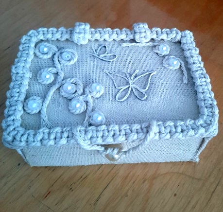 Шкатулка выполнена из материала "двунитка" и льняного шпагата. Крышка украшена бусинами.Данные участника