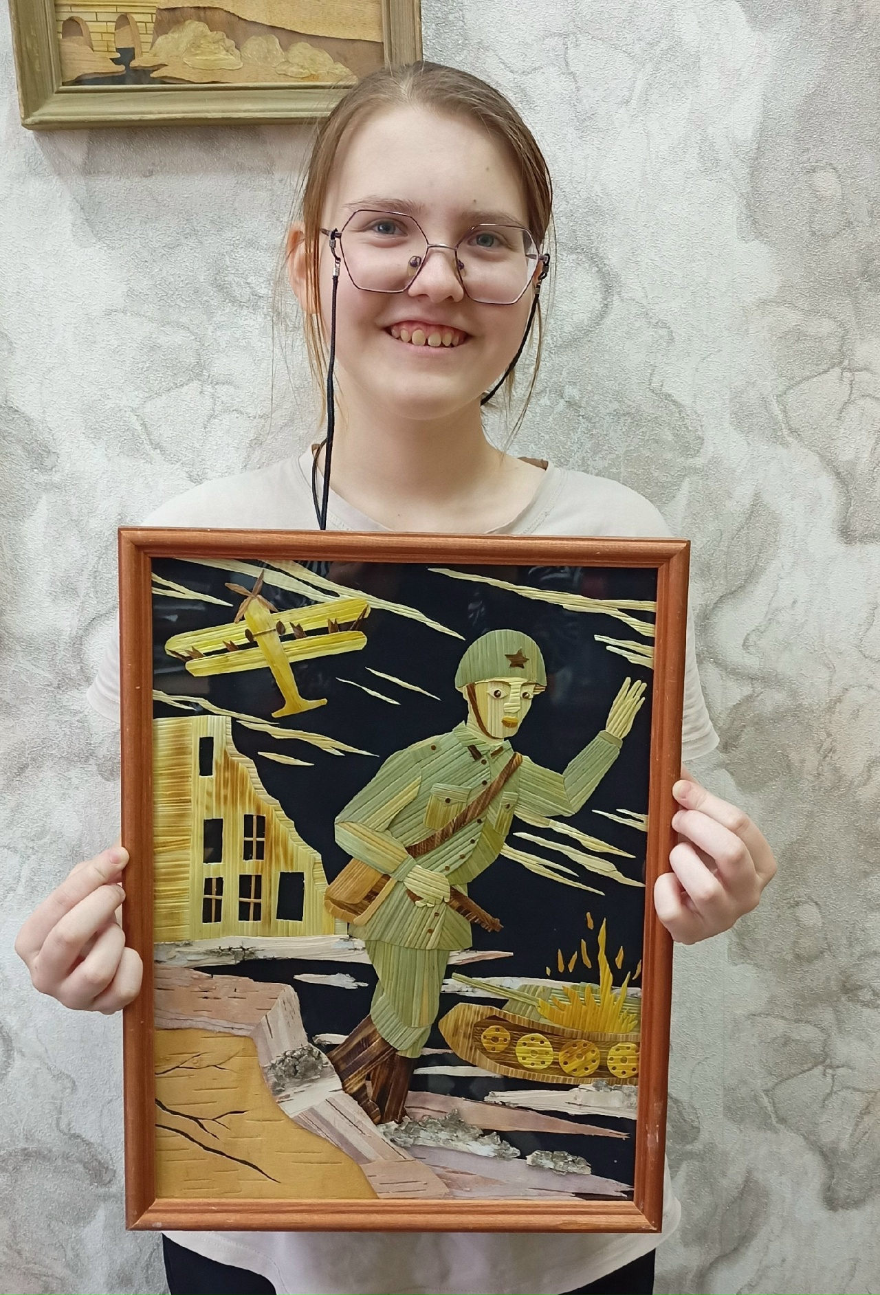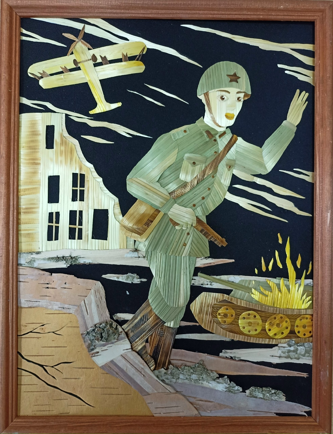 Аппликация из соломы и бересты. Работа 30x40. Работу выполнила девочкой из школы-интерната. Где живут и обучаются дети с ограниченными возможностями. Героическая оборона многих городов и победа под Москвой сорвали планы Гитлера на «блицкриг» и быстрое завершение войны.Данные участника