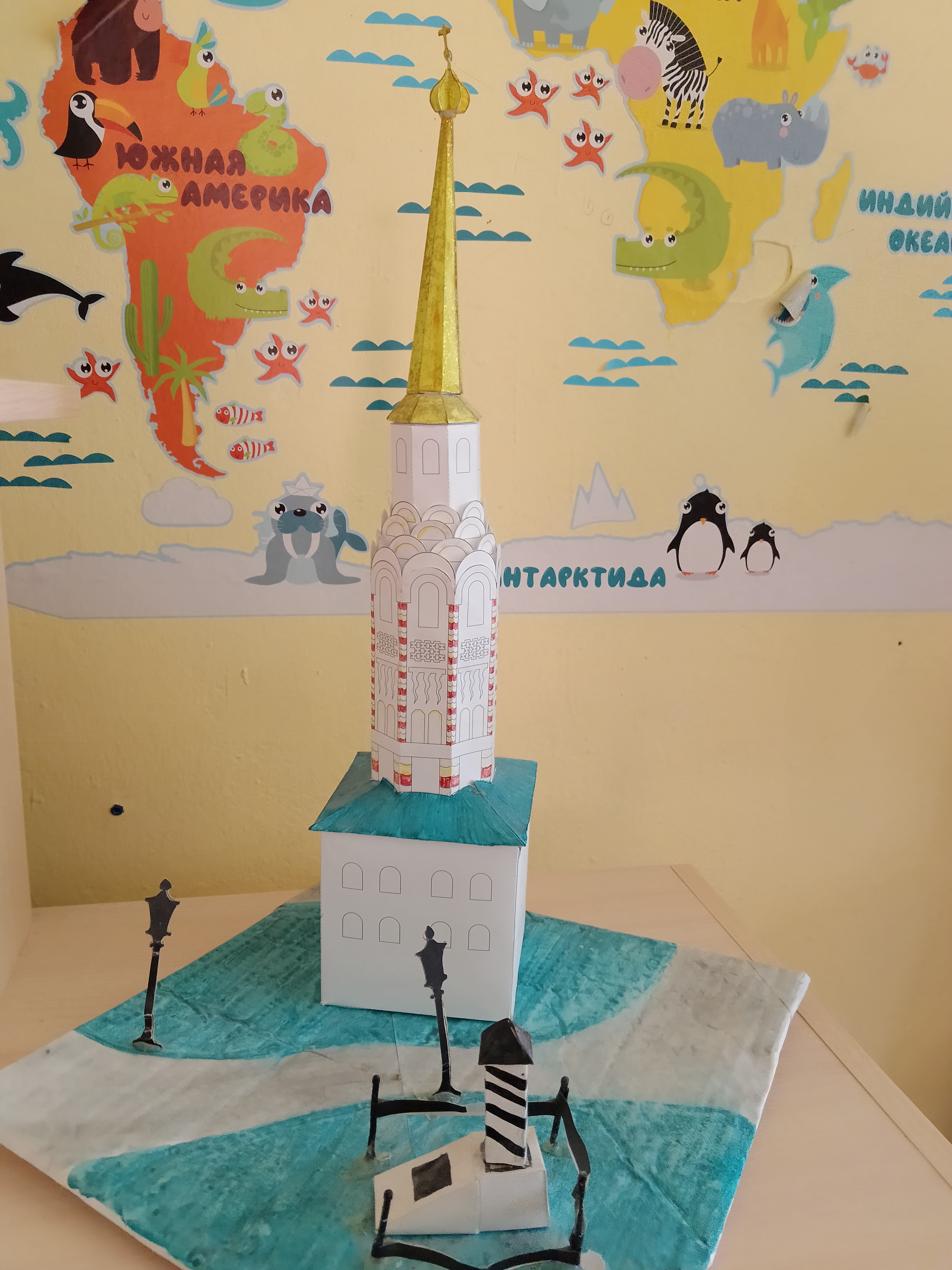 Соборная колокольня сделана из бумаги и раскрашена фломастерами. Рядом с колокольней стоит верстовой столб начало пути.Данные участника