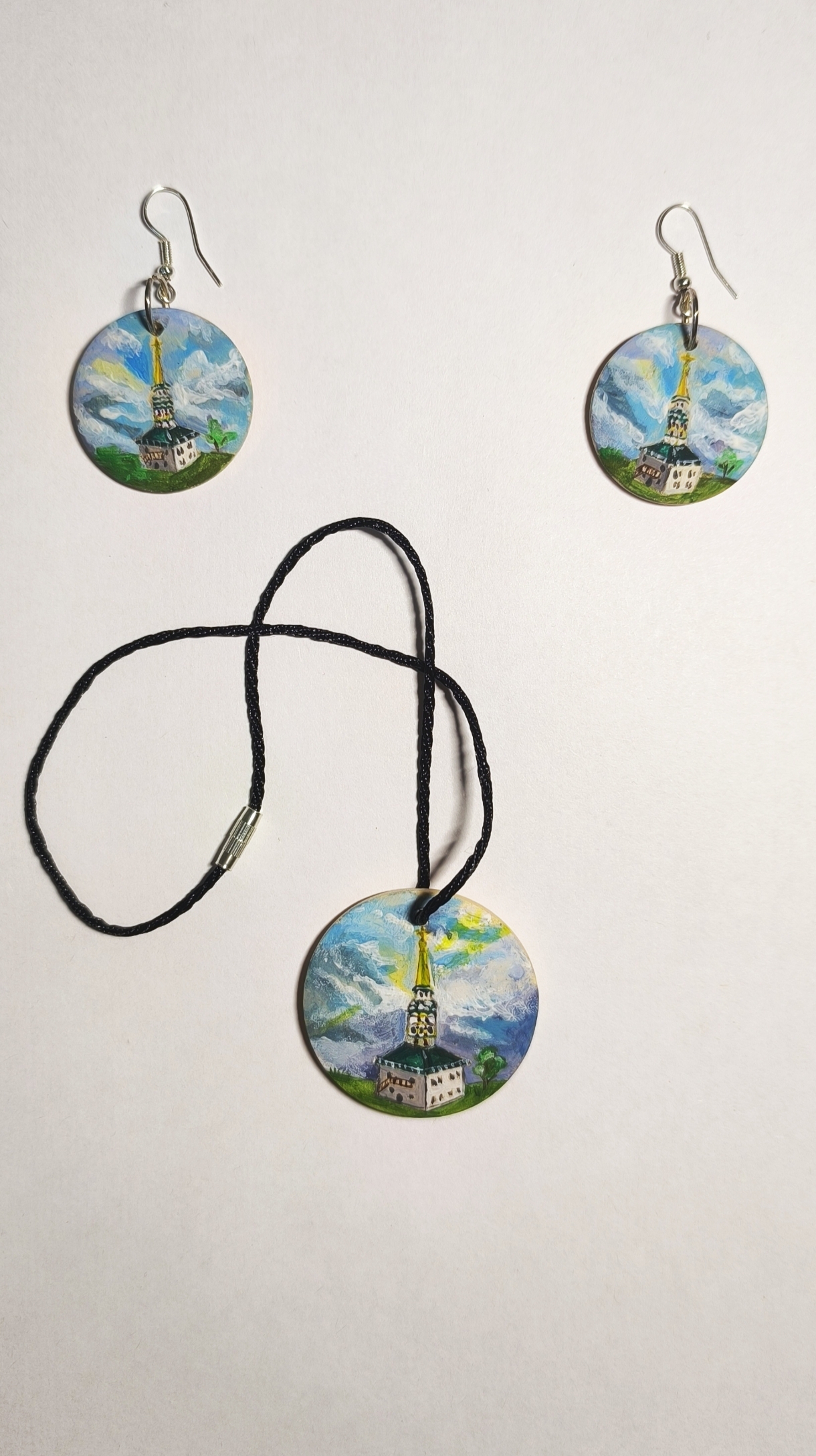 Комплект, состоящий из серёжек и кулона. Серёжки и кулон сделан из деревянных круглых заготовок. На них нанесён рисунок Соборной колокольни, с помощью акриловых красок, и покрыт бесцветным лаком.Данные участника