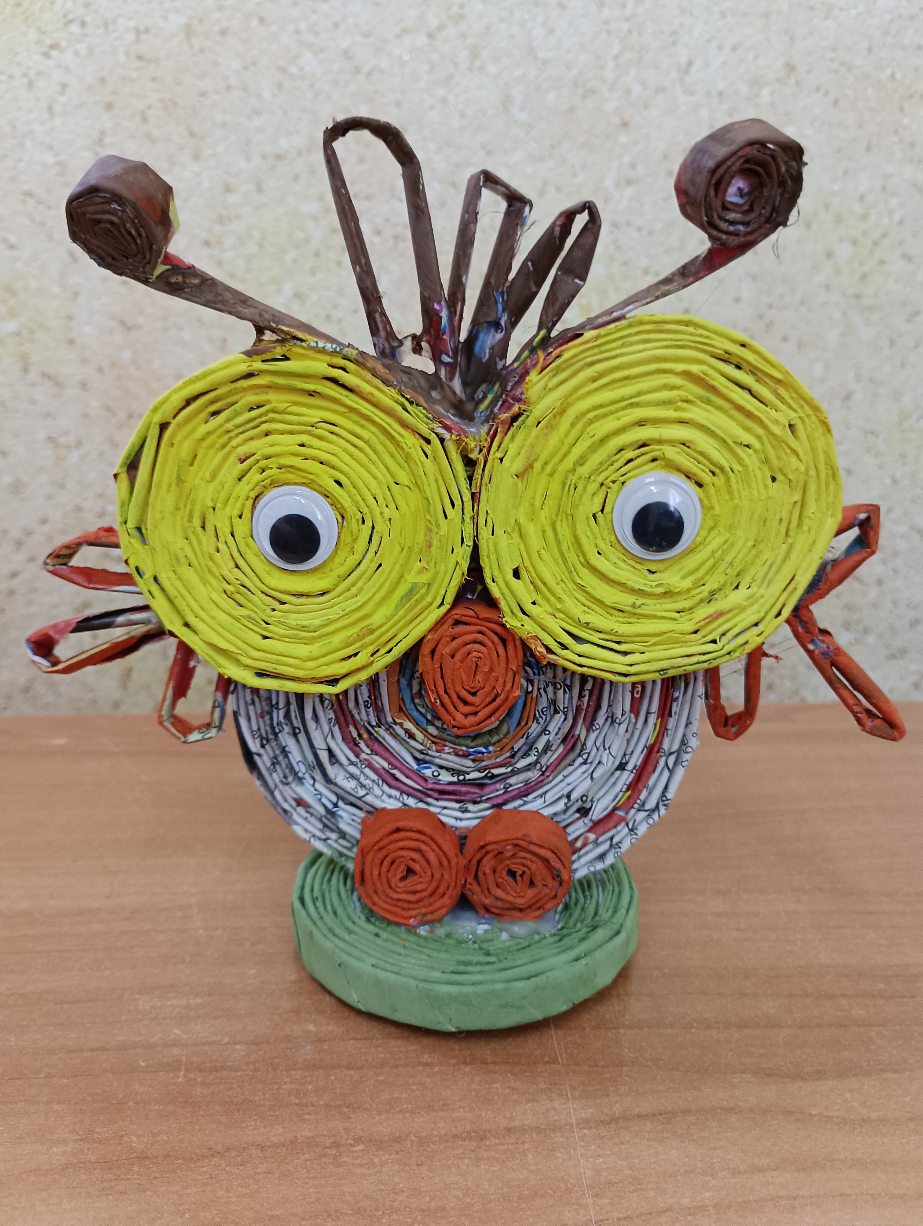 Представляем поделку «Сова», выполненную из газетных трубочек, клея и гуаши.Основу работы составляют аккуратно скрученные газетные трубочки, которые придают поделке прочность и оригинальную текстуру. С помощью клея трубочки надежно закреплены, гуашь используется для раскрашивания поделки, придавая ей выразительные цвета и оживляя образ мудрой птицы. Такой материал и техника делают работу не только красивой, но и экологичной, ведь в процессе используется переработанная бумага.Данные участника