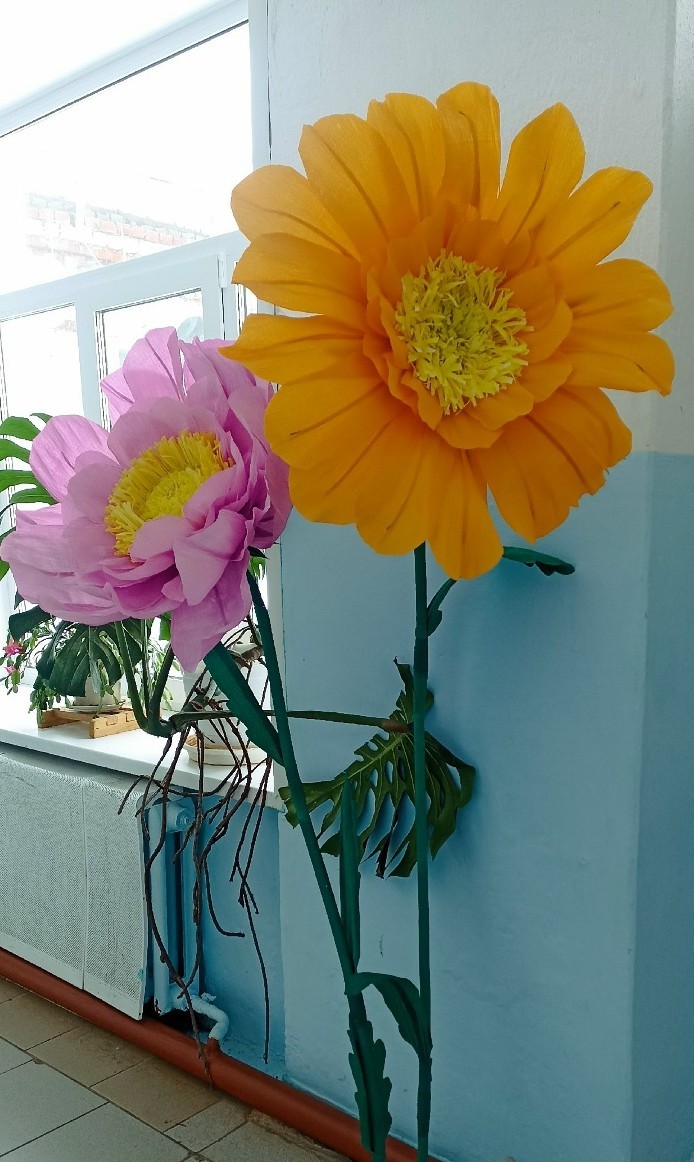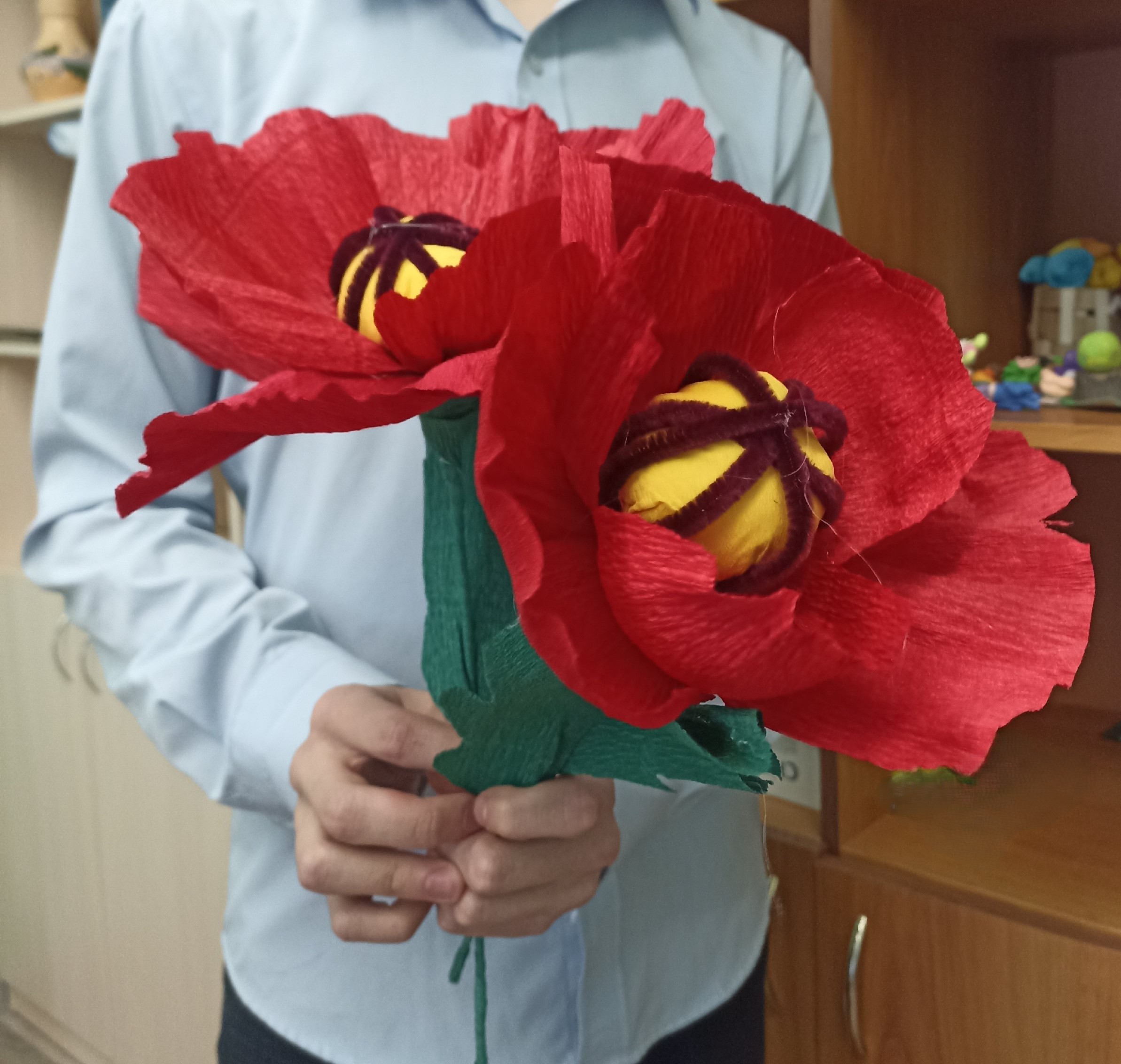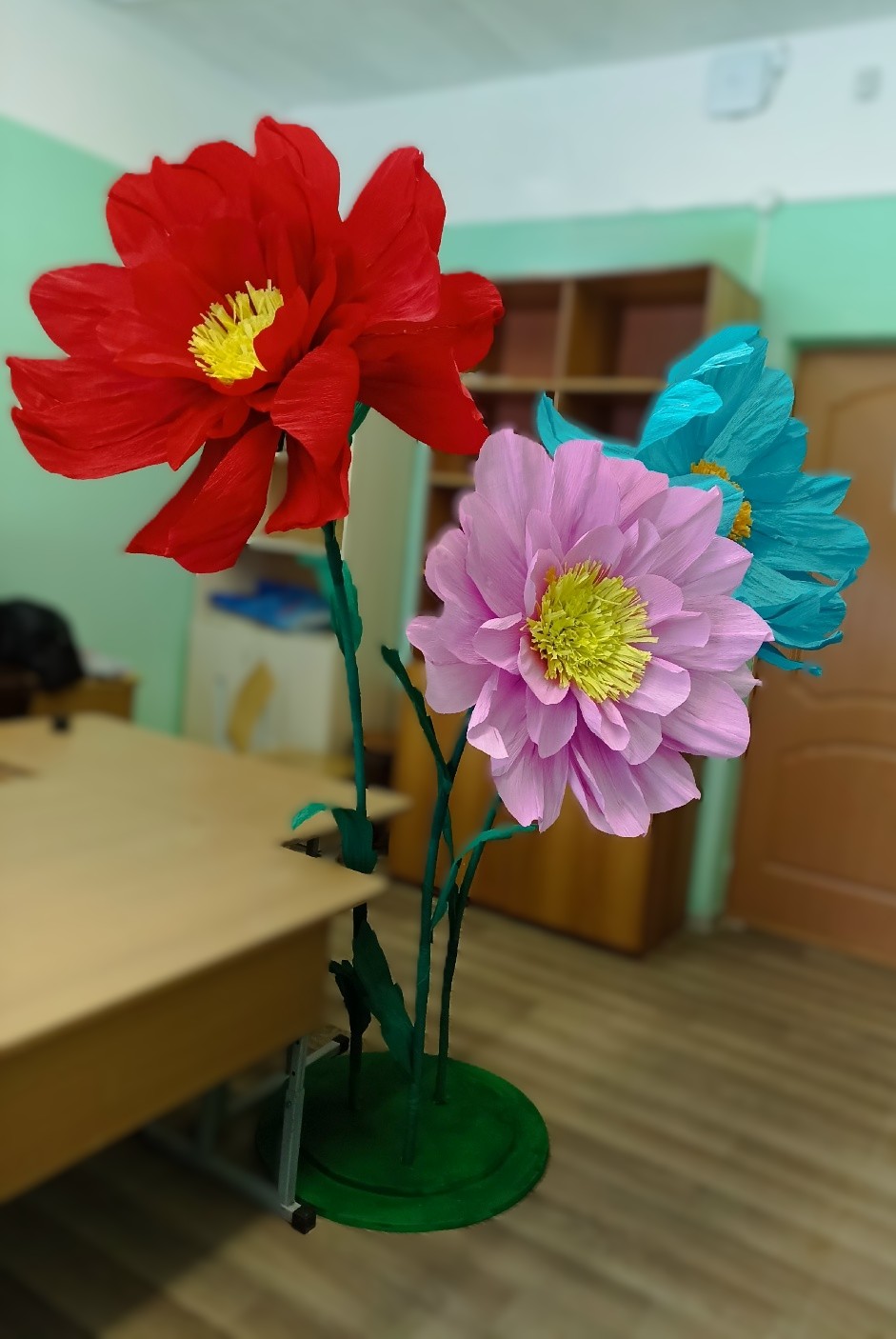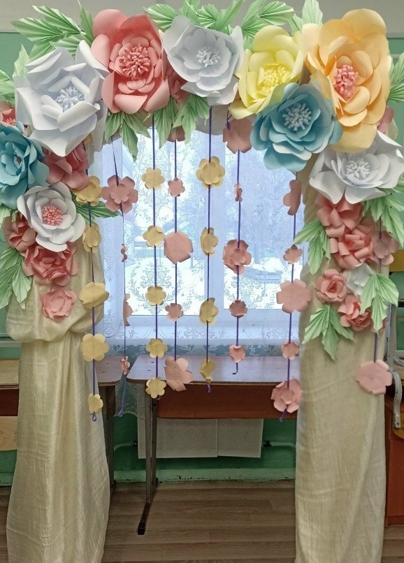 Цветочная арка выполнена из цветной бумаги. Ростовые цветы и маки выполнены из гофрированной бумаги.Данные участника