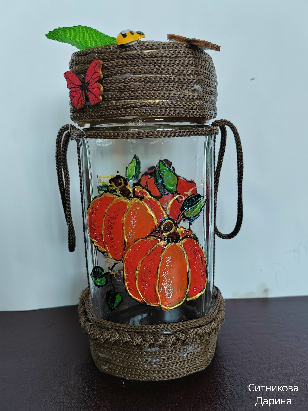 Стеклянная баночка с витражной росписью и оформлением декоративных элементов.Данные участника