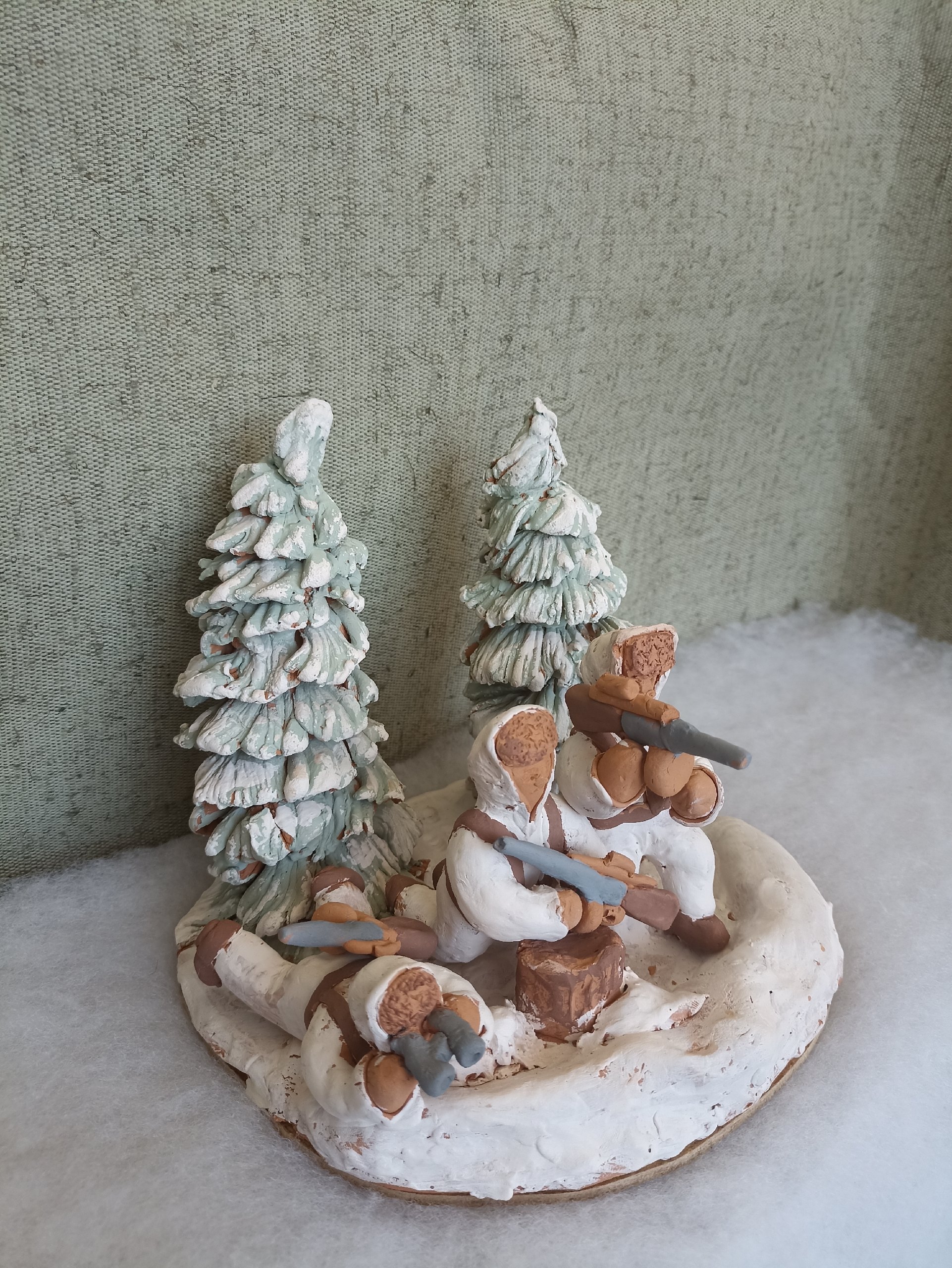 Размер работы 20*15*20 см, ручная лепка из глины. Работа выполнена на реальных событиях моего прадеда, который воевал в Заполярье, на северном фронте. Три разведчика в заснеженном лесу, приказ - "взять языка". Боевая задача выполнена. За этот подвиг мой прадедушка был удостоен - орденом Красной звезды.Данные участника