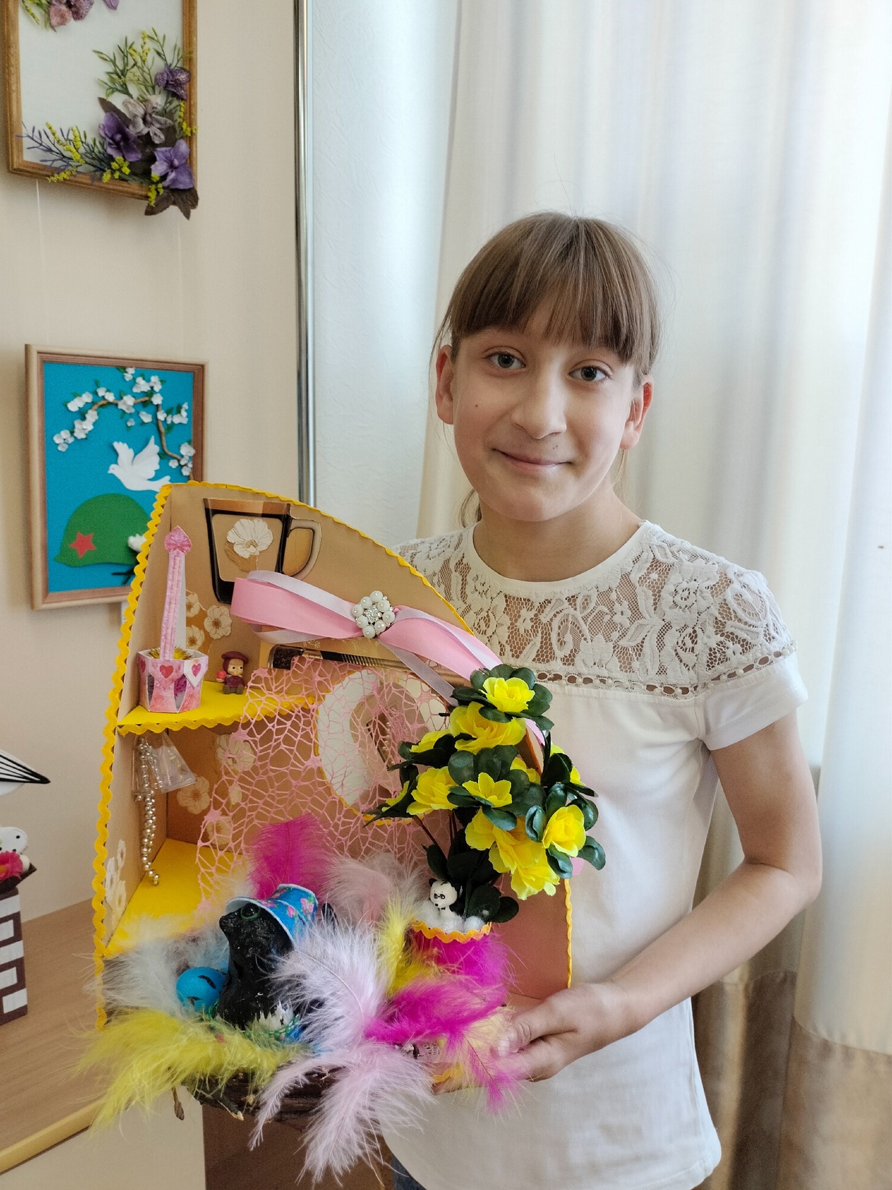 Макет дома для вороны создавался на основе упаковочного картона, и двухстороннего цветного картона. Гнездо выполнено в технике папье - моше с добавлением перьев и берёзовых веточек. Птица изготовлена аналогично, и одета с использованием фетра. Замечательная комната для игры дополнена деталями из современных материалов. Для эстетического оформления применялись акриловые краски.Данные участника
