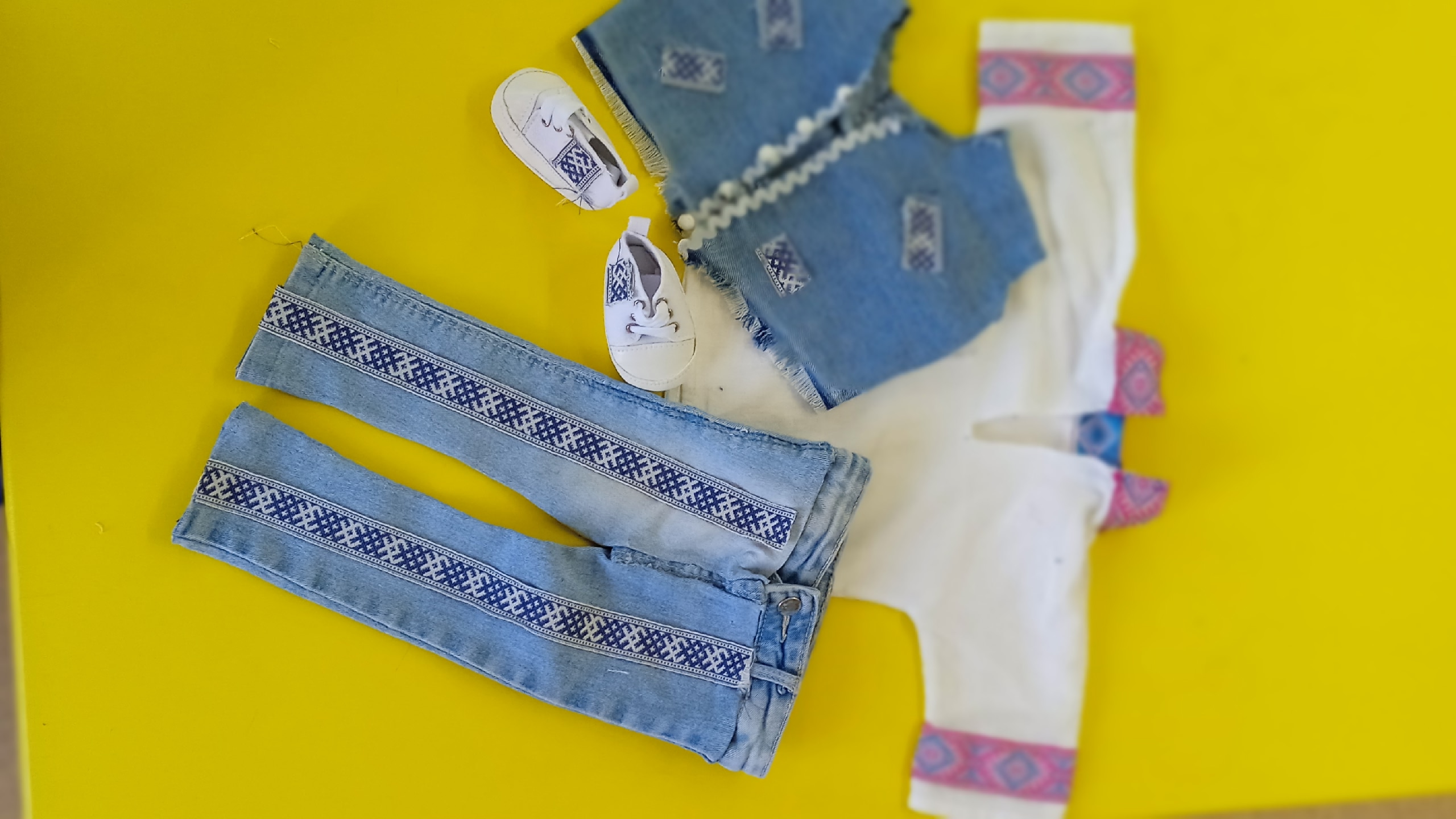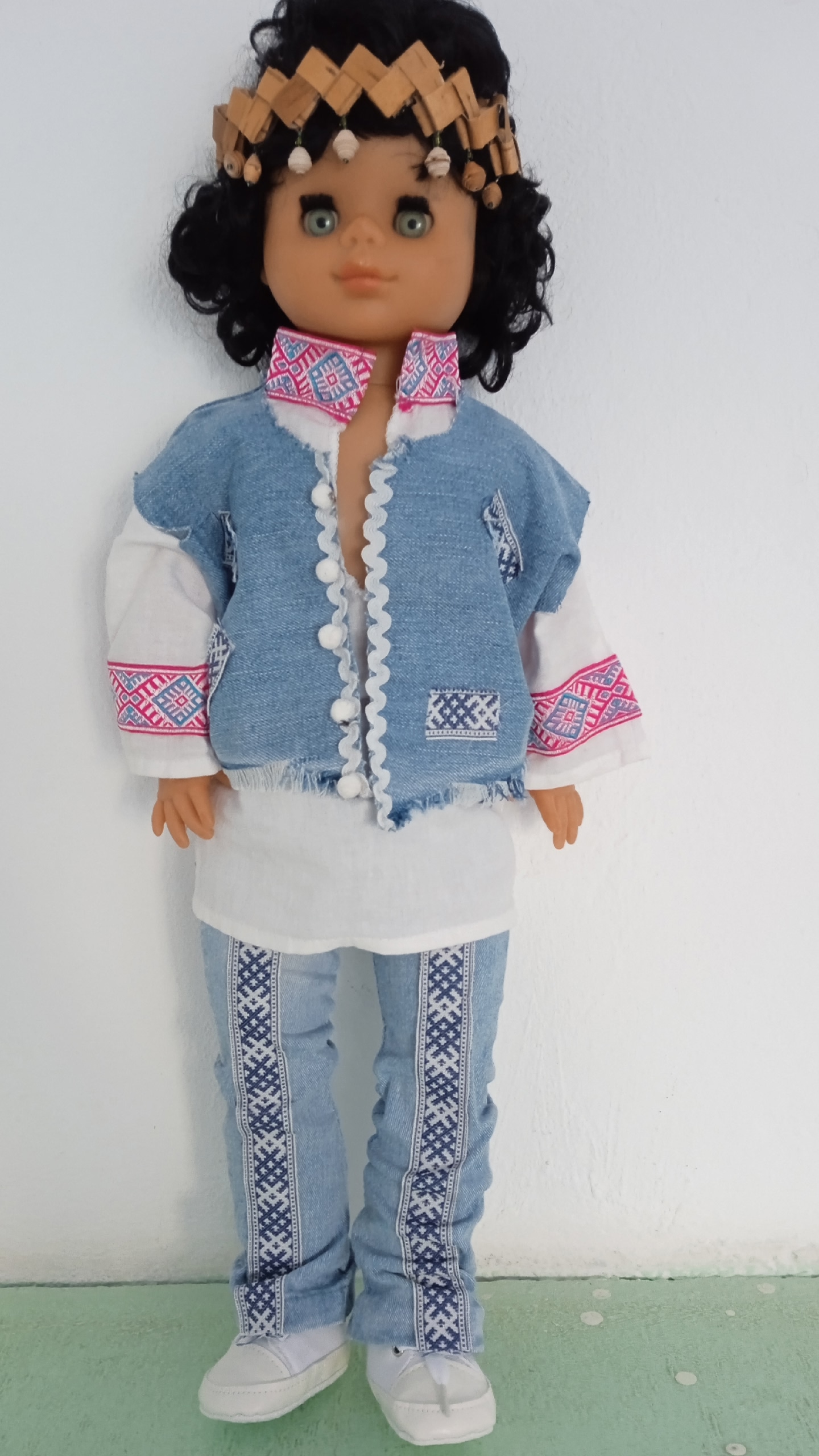 В каждом детском гардеробе можно найти джинсовые изделия они идеально сочетают стиль и комфорт, позволяя создавать множество образов на любой случай. Для куклы сшит костюм из жилетки и брюк из джинсовой ткани, с окантовкой коми- пермяцкого орнамента. Рубашка - косоворотка.Данные участника